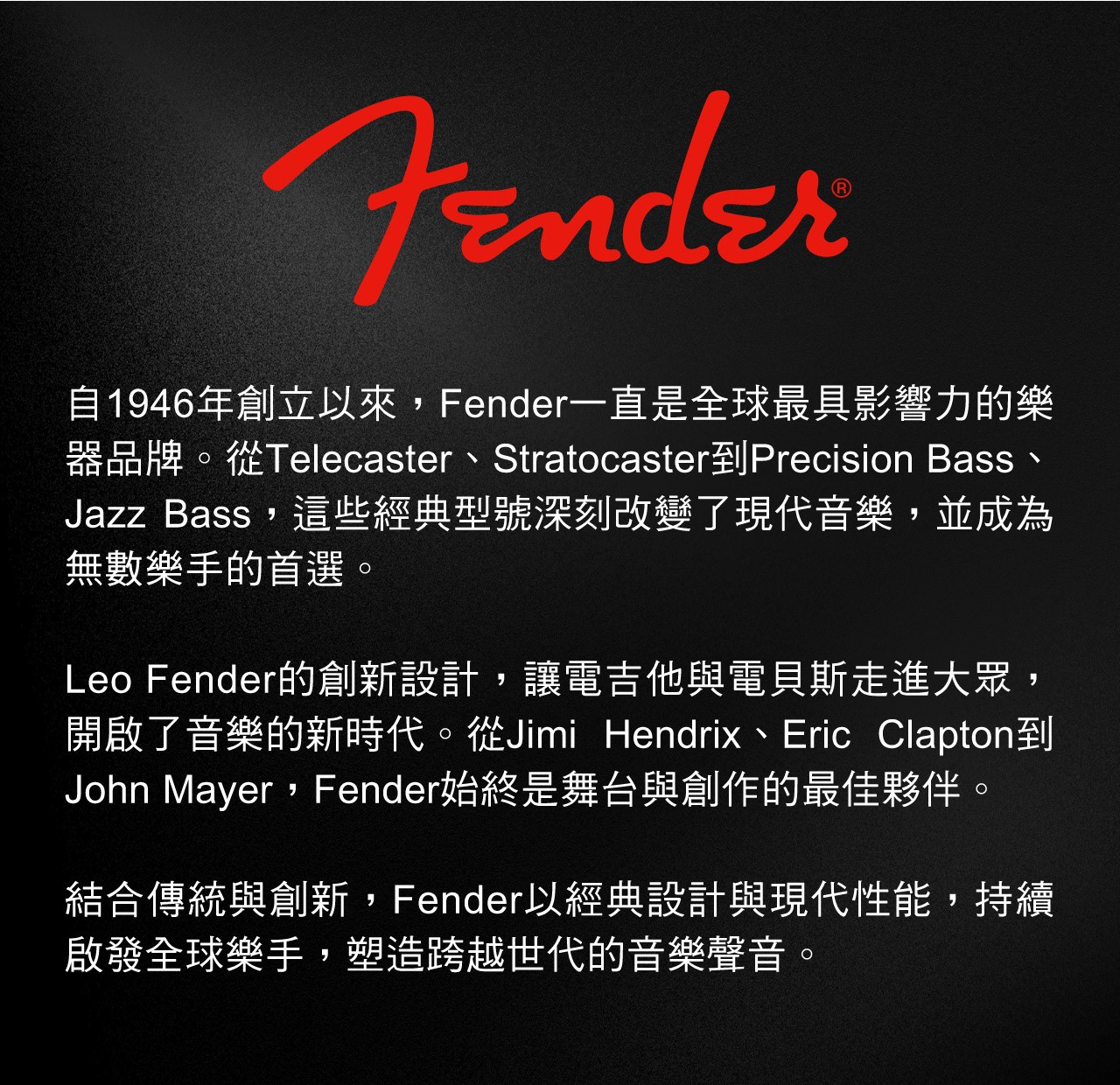 Fender 成立於1946年,是全球最具代表性的電吉他品牌,以明亮、清脆的「單線圈」音色聞名,適合搖滾、藍調、流行樂。核心經典琴款為 Stratocaster (Strats) 和 Telecaster (Tele),並擁有副廠 Squier 作為新手入門首選。其琴身多為赤楊木或梣木,手感舒適,是初學者與職業樂手的信賴之選